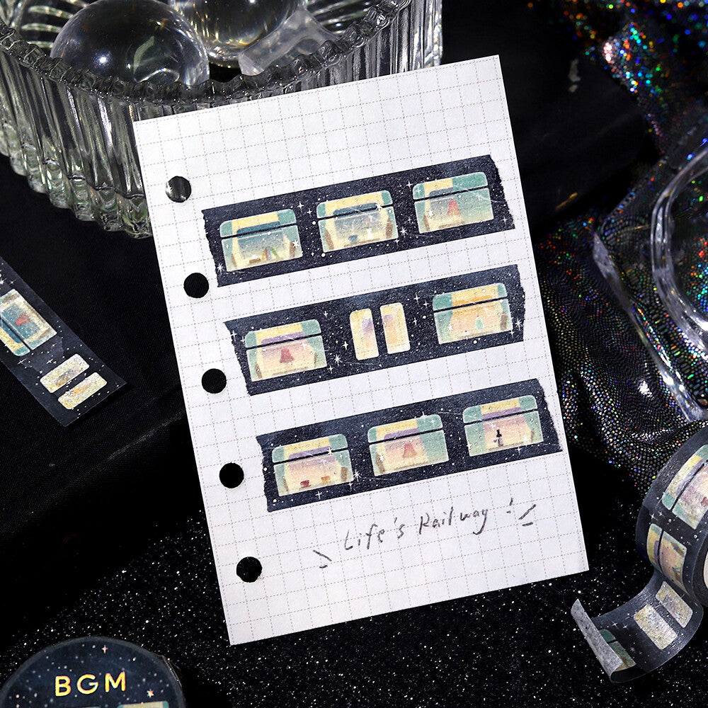 Precioso washi tape con foil plateado. La ilustración muestra las ventanas de un tren nocturno.