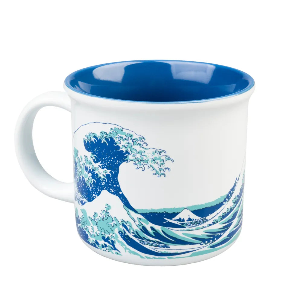 Taza de cerámica con la ilustración de La gran ola de Kanagawa, de la serie Treinta y seis vistas del Monte Fuji del artista Katsushika Hokusai.